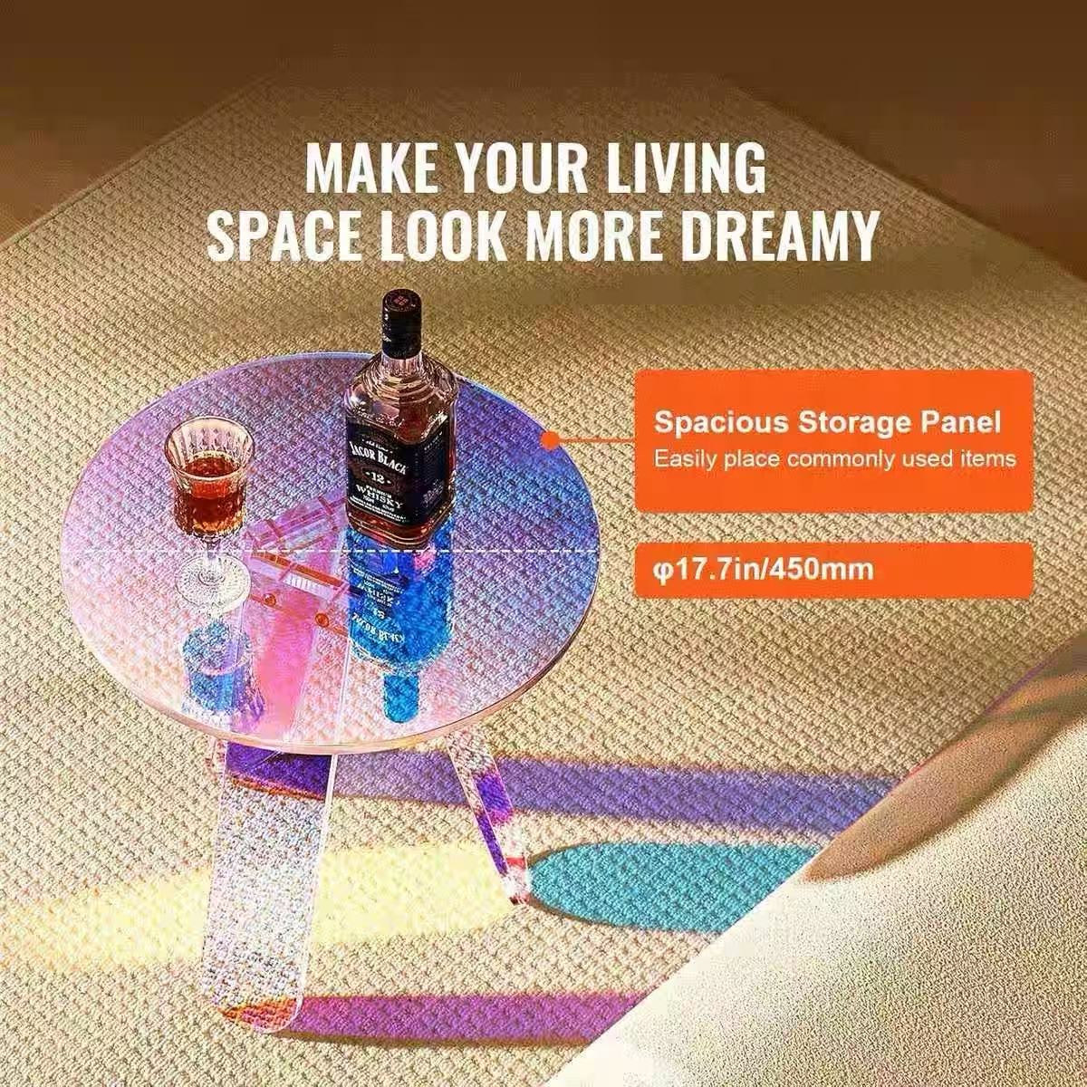 This professional-grade iridescent acrylic side table combines precision CNC machining with premium PMMA material engineering. The dichroic film lamination creates stunning rainbow light refraction that changes dynamically based on viewing angle and lighting conditions.