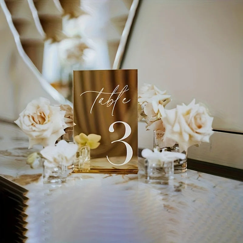 Transform your wedding reception or special event with these elegant gold acrylic table numbers. Crafted from premium clear PMMA (acrylic) with precision laser cutting, each table marker features stunning gold UV-printed numbers and includes a sturdy stand for effortless display.